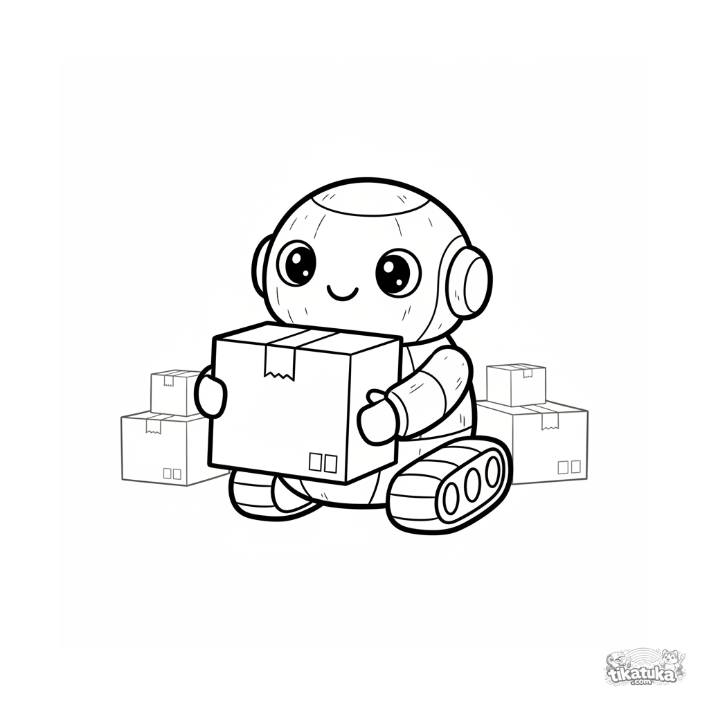 Página para colorear muy simple para niños pequeños 2-3: un robot redondo y sonriente sobre orugas lleva una caja enorme en un almacén. Márgenes amplios, contornos gruesos, fácil de colorear.