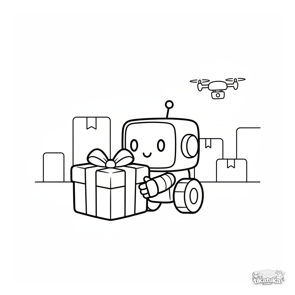 Página para colorear muy simple para niños pequeños: un robot pequeño empuja una caja grande por el suelo de un almacén. Formas grandes, mínimo detalle.