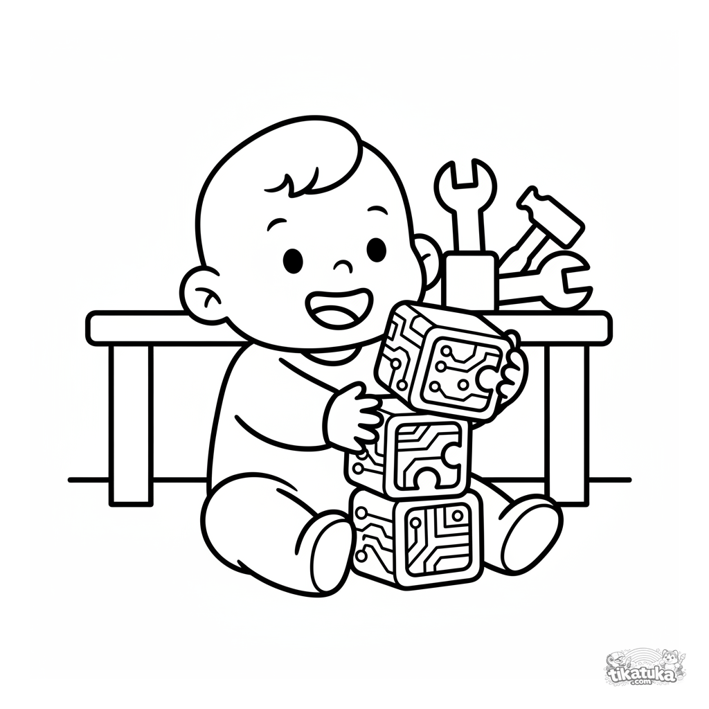 Página para colorear muy simple para niños pequeños de 2-3 años: un niño feliz construye una torre con grandes bloques con patrones de circuitos en un laboratorio.