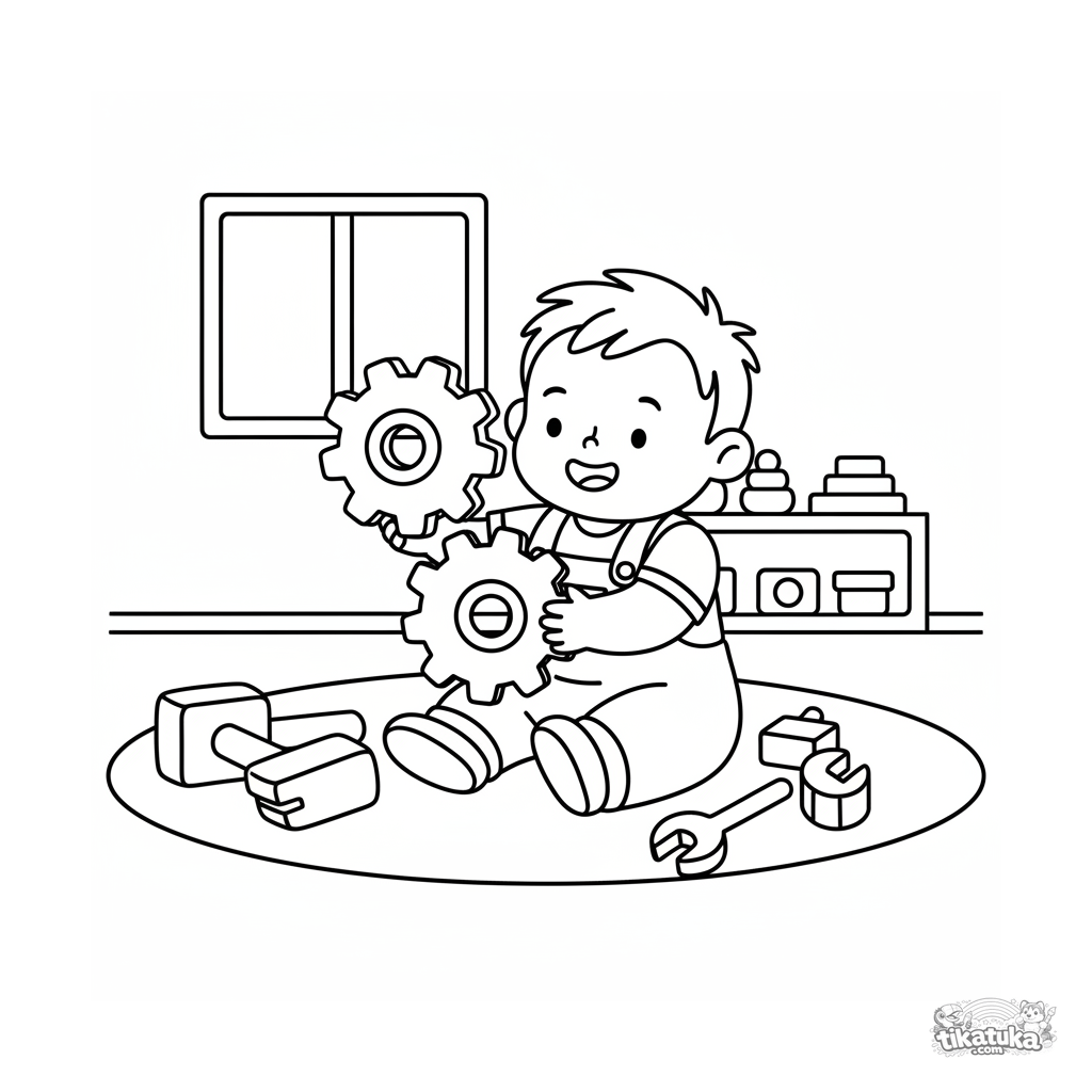 Página muy simple para colorear para niños pequeños: un niño apila engranajes gigantes en la zona de juego.