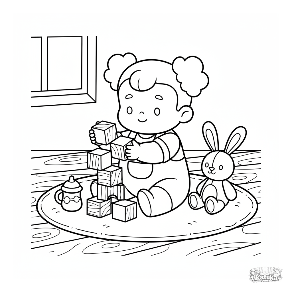 Página para colorear muy simple para niños pequeños 2-3: un niño construye una torre con bloques en el suelo del porche. Formas grandes, contornos claros, perfecto para primeros intentos de colorear.
