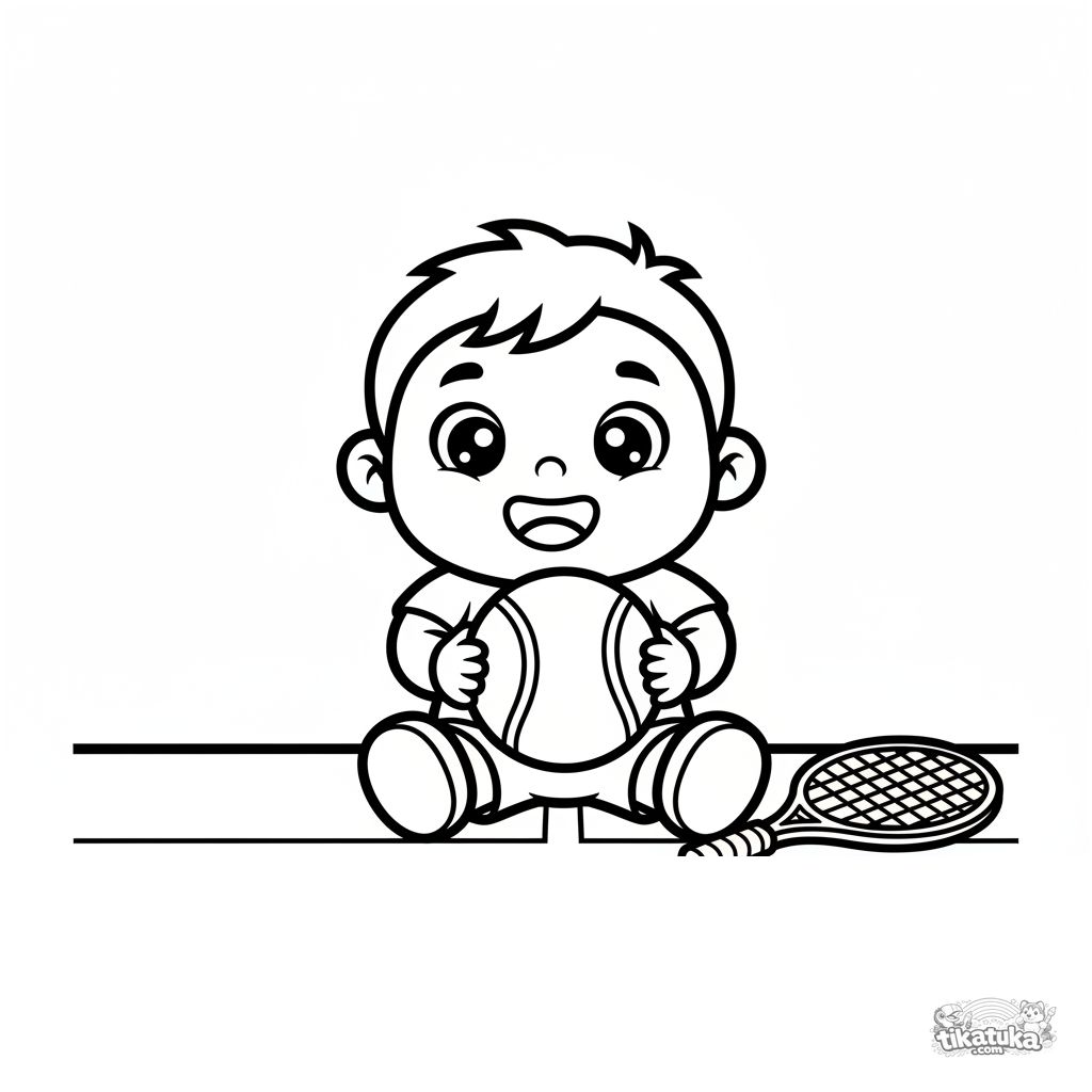Página para colorear para niños de 2-3 años: un niño sentado en una pista de tenis con una pelota grande. Formas simples, márgenes amplios.