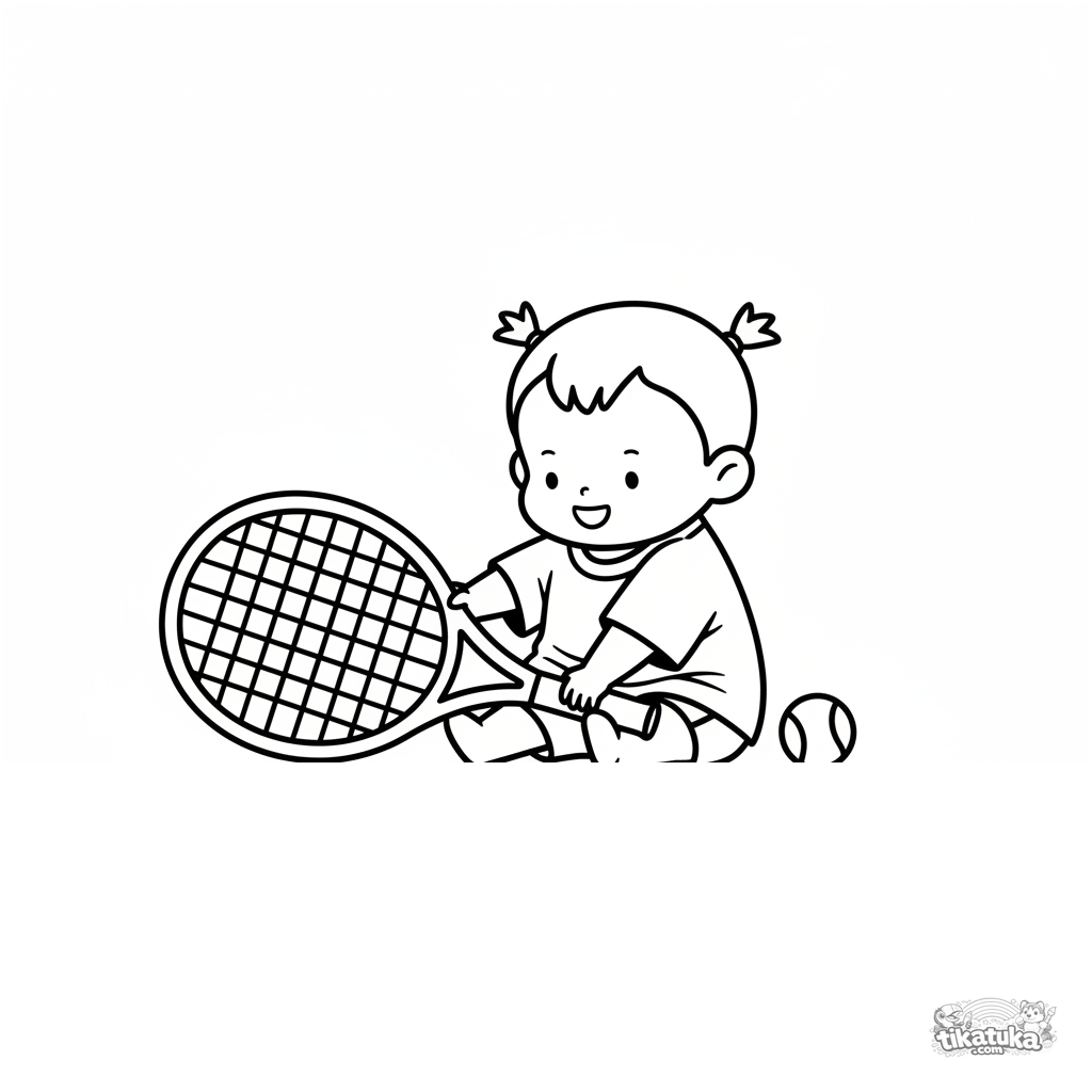 Página para colorear para niños pequeños de 2-3 años: un niño divertido en una cancha de tenis explorando una raqueta grande. Formas simples enormes, mínimo detalle, márgenes amplios.