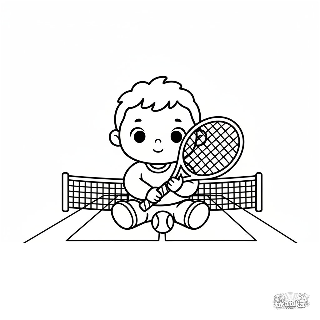 Página para colorear muy simple para bebés de 2-3 años: un niño sentado en la pista con una raqueta grande. Formas grandes, contornos gruesos.