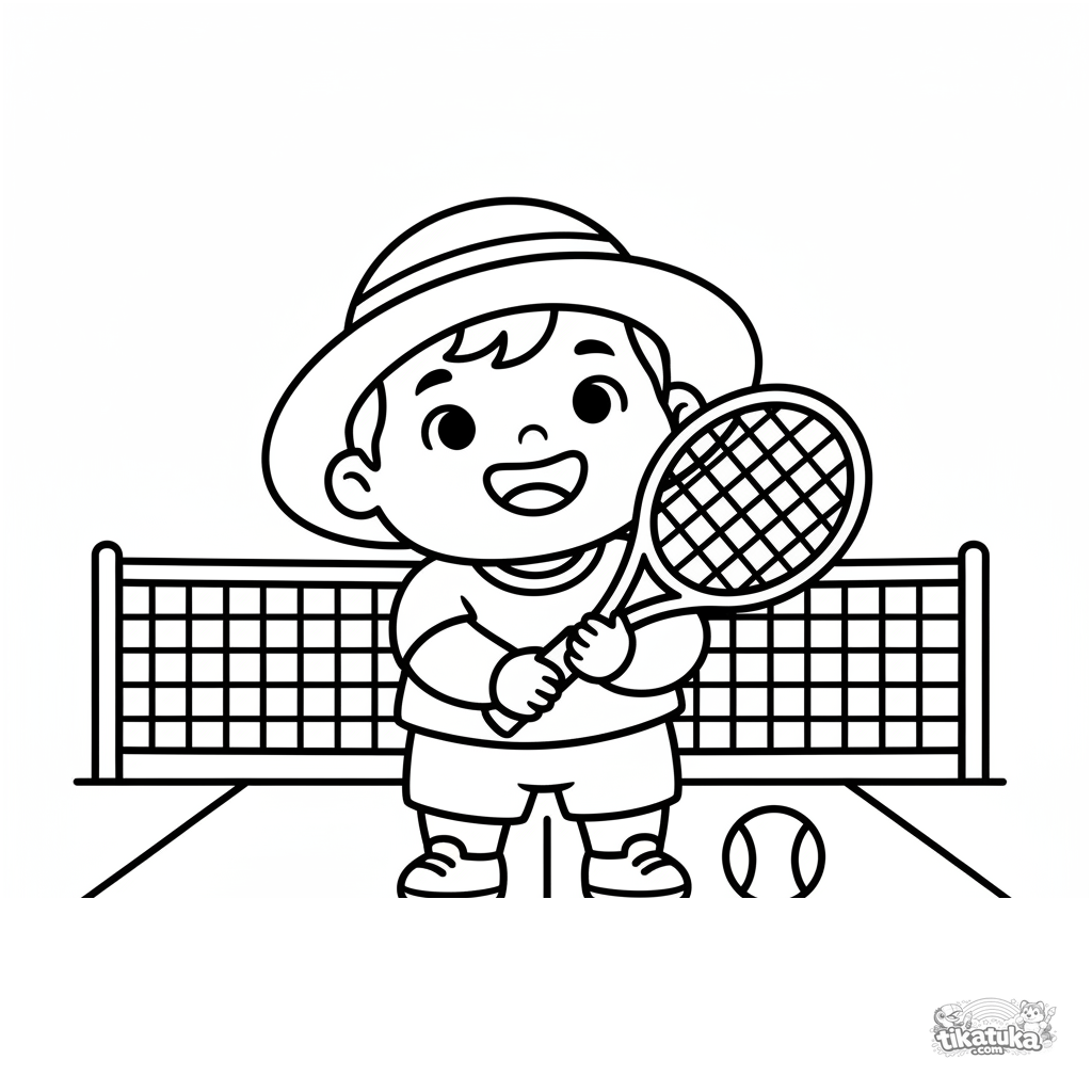 Página para colorear para niños pequeños 2-3 años: un niño feliz con sombrero en una cancha de tenis con raqueta grande. Formas simples, detalles grandes, márgenes amplios.