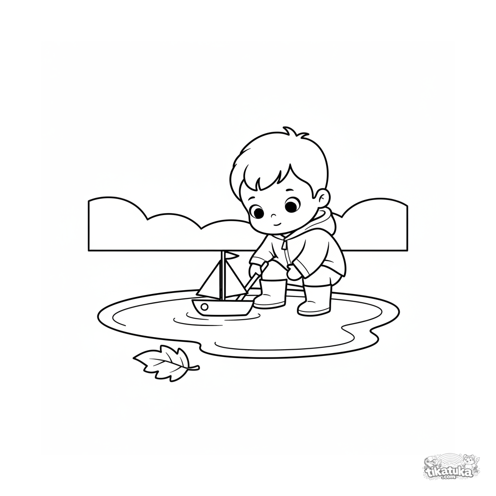 Página para colorear para niños pequeños de 2-3 años: un niño con traje de lluvia lanza un barco de juguete en un charco de otoño. Formas grandes y cerradas, líneas muy simples.