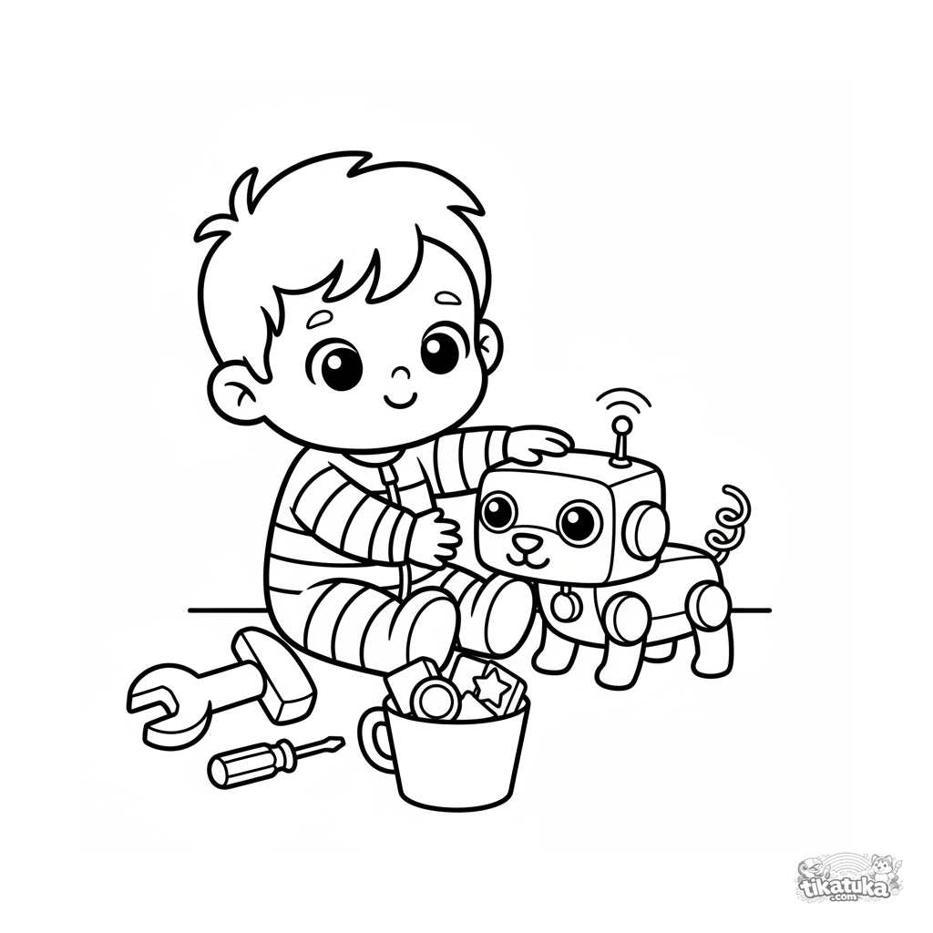 Página simple para colorear para niños pequeños de 2-3 años: un niño y un perro robot en un laboratorio secreto.