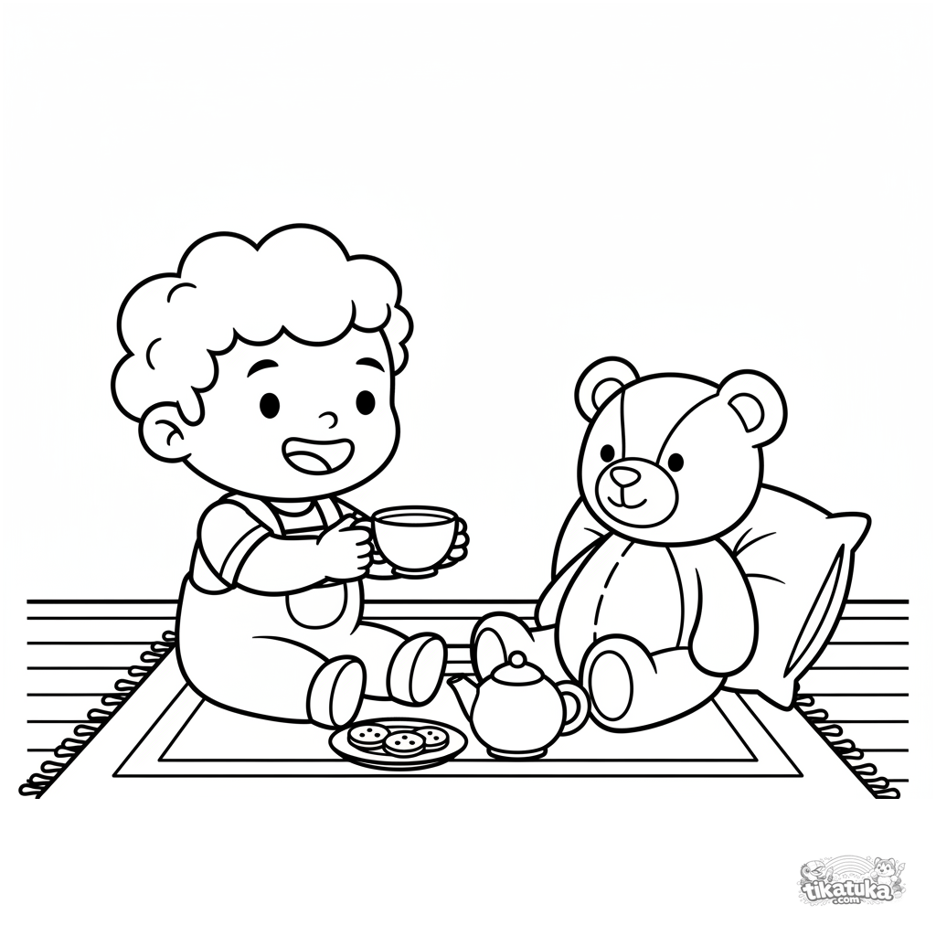 Página simple para colorear para bebés 2-3 años: un niño en una fiesta de té imaginaria con un oso de peluche en la alfombra del porche. Figuras grandes.