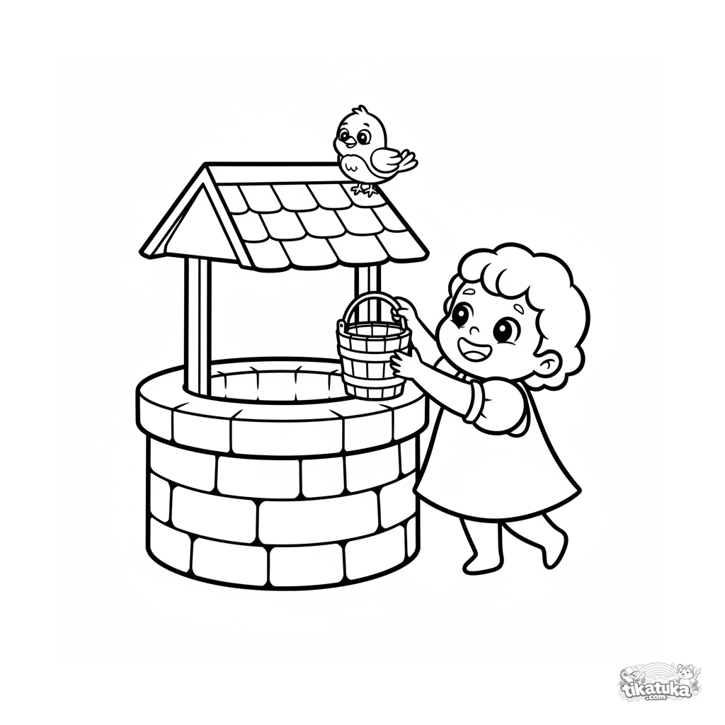 Página para colorear muy simple para niños pequeños 2-3: un niño con un cubito en un pozo. Formas grandes, contornos gruesos, escena centrada.