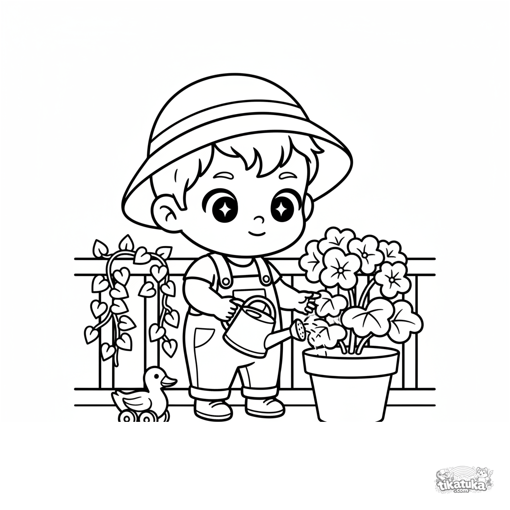 Página para colorear simple para niños pequeños 2-3: un niño regando flores en el porche de una dacha. Formas grandes, contornos claros, mucho espacio libre.