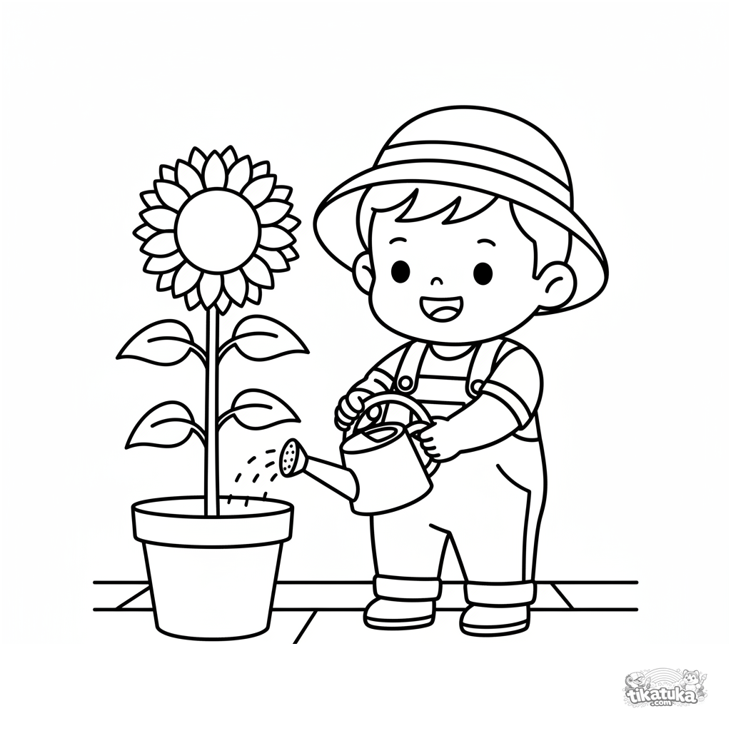 Página para colorear simple para bebés de 2-3 años: un niño regando una flor grande en el porche. Formas grandes y claras, márgenes amplios.