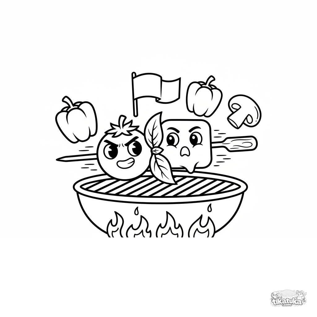 Página para colorear para niños de 7-9 años: una brocheta caprese con tomate y mozzarella corriendo por la parrilla. Escena dinámica con una hoja de albahaca.