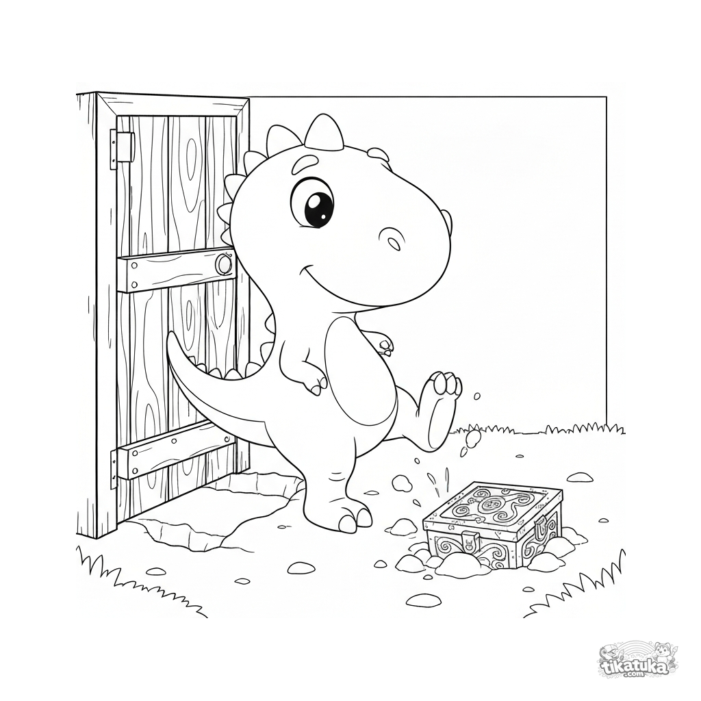 Tosha el dinosaurio excava junto a una puerta y descubre un cofre misterioso. Descárgala, imprímela o coloréala online.