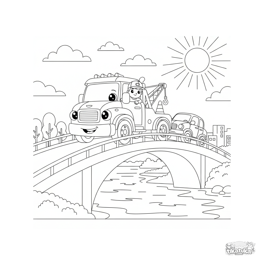Página para colorear para niños 4-6: una grúa amistosa remolca un coche averiado por un puente sobre un gran río. Formas simples y escena clara.