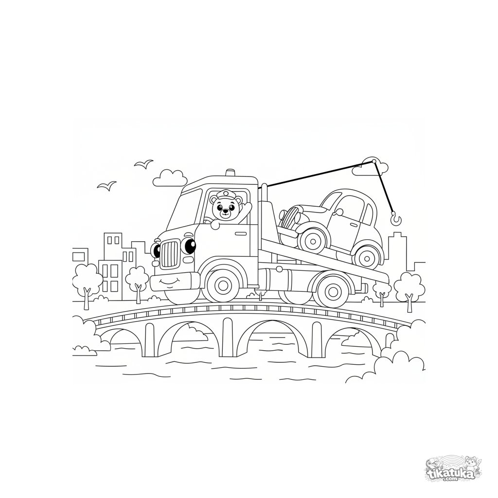 Página para colorear para niños de 4-6 años: una grúa remolcando un coche en un puente sobre el río. Escena de acción para niños.