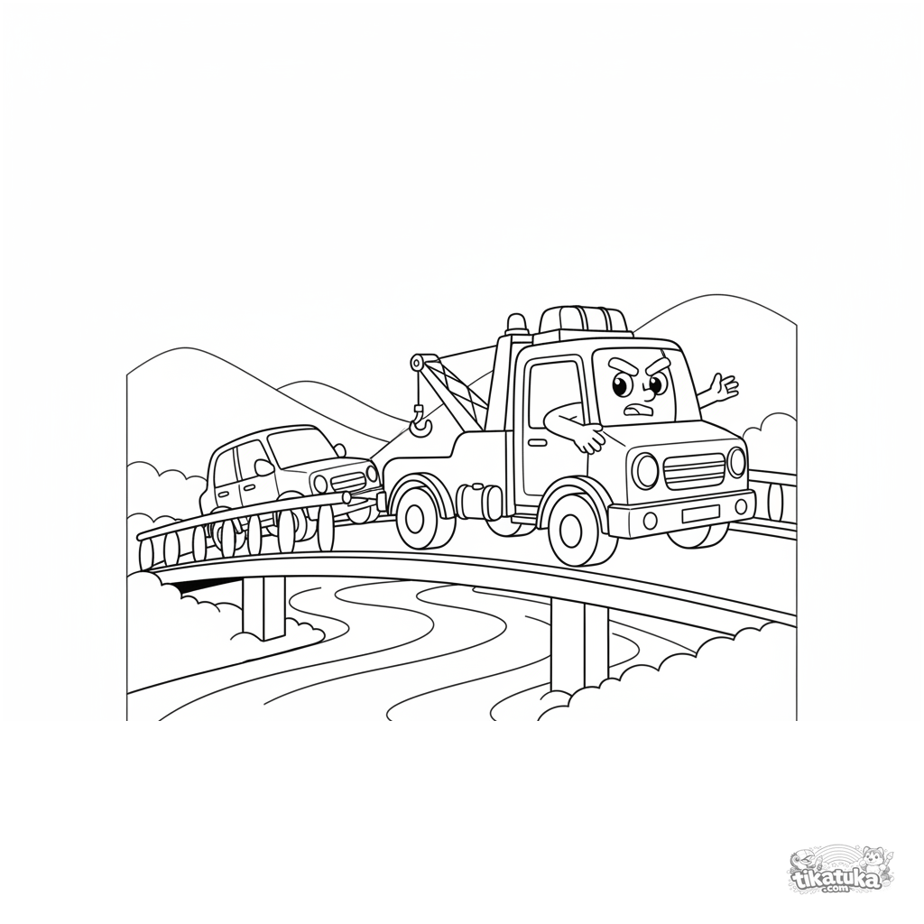 Página para colorear para niños: una grúa rescatando un coche atascado en un puente sobre un río. Para niños de 7 a 9 años. Escena de rescate dinámica con contornos claros.