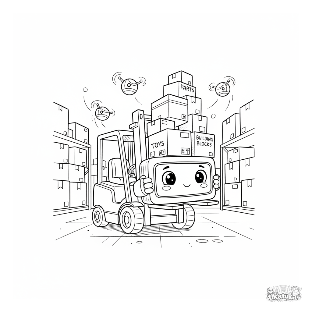 Página para colorear para niños 4-6 años: un robot montacargas apilando cajas en un almacén, con drones volando. Contornos claros, formas simples.