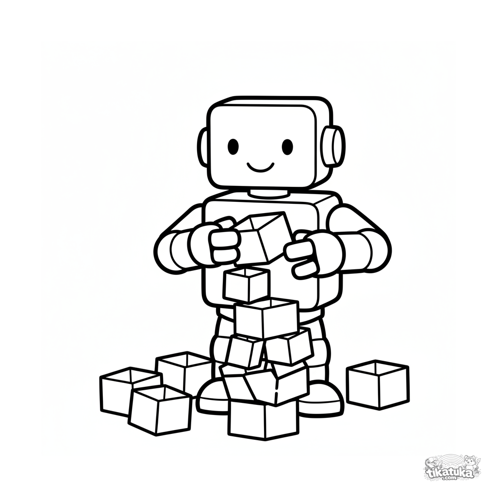 Página simple para colorear para bebés 2-3: un alegre robot que parece un juguete de madera construye una torre con cajas de cartón pequeñas en un rincón del almacén.
