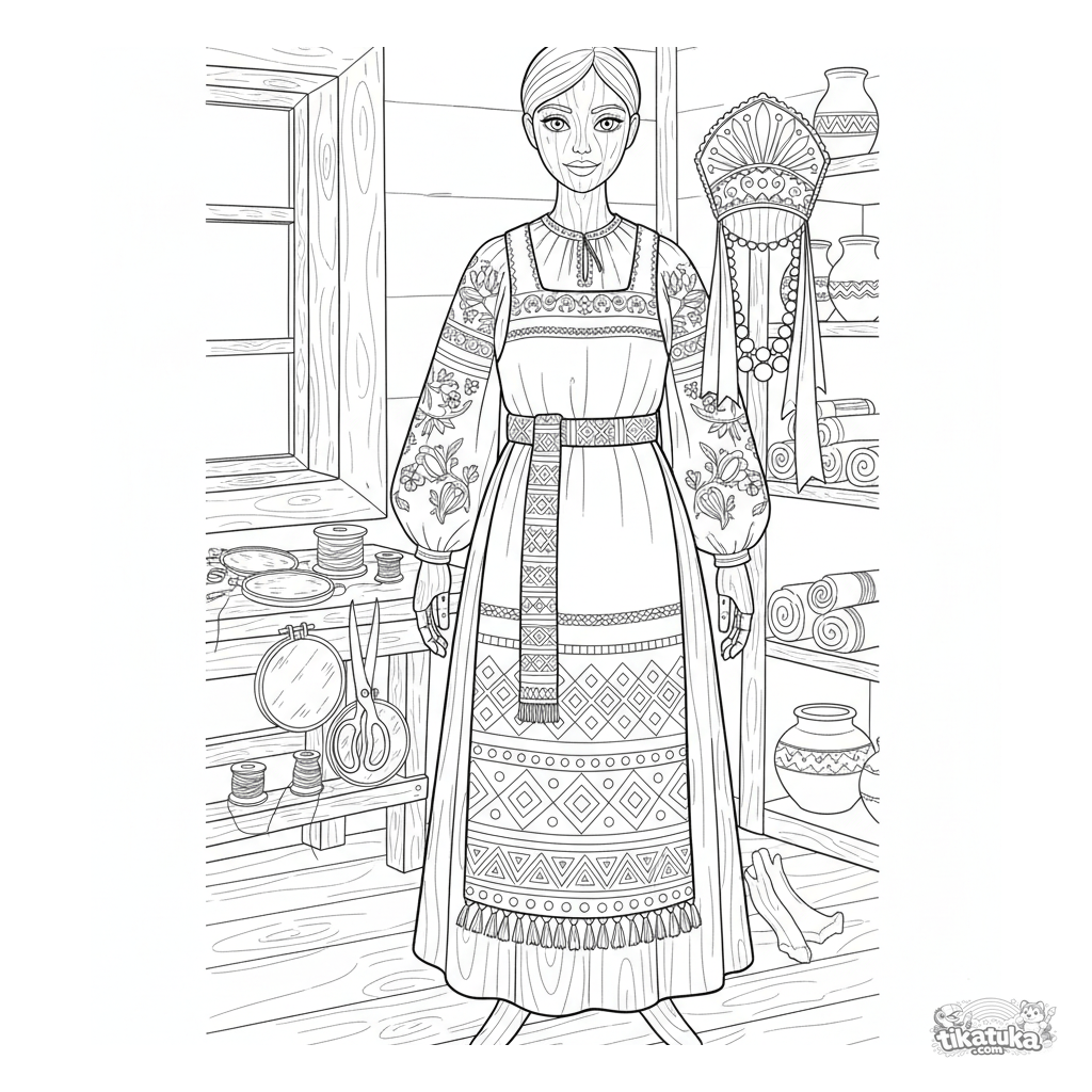Página para colorear detallada: un traje tradicional ruso (blusa bordada y sarafán) en un maniquí de madera en un taller. Patrones intrincados, herramientas de costura. Para niñas 10-12.