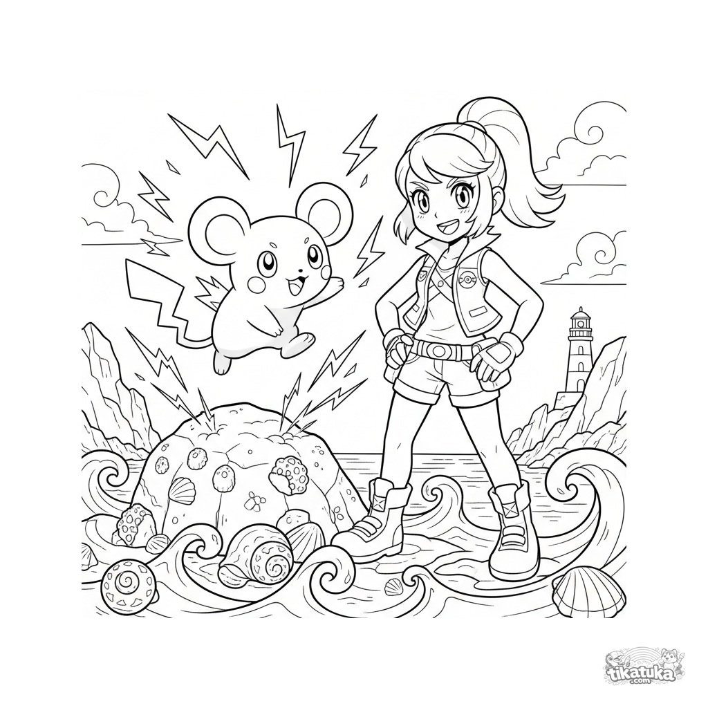 Página para colorear estilo anime vibrante para 10-12 años. Una entrenadora y su Pokémon eléctrico practican movimientos en una playa rocosa, generando chispas de energía.