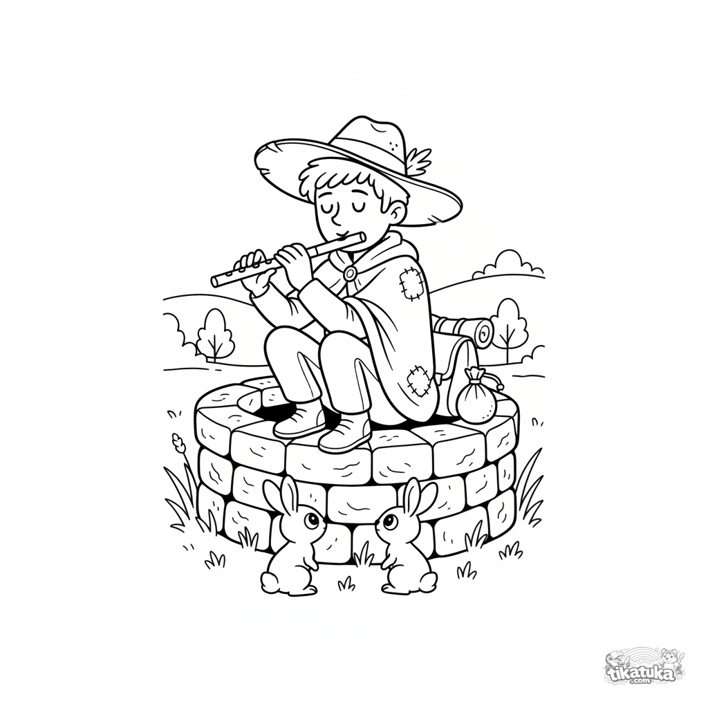 Página para colorear para niños 7-9: un músico viajero toca la flauta junto al pozo, mientras conejos escuchan su melodía. Escena en estilo naturalista de guía de campo.