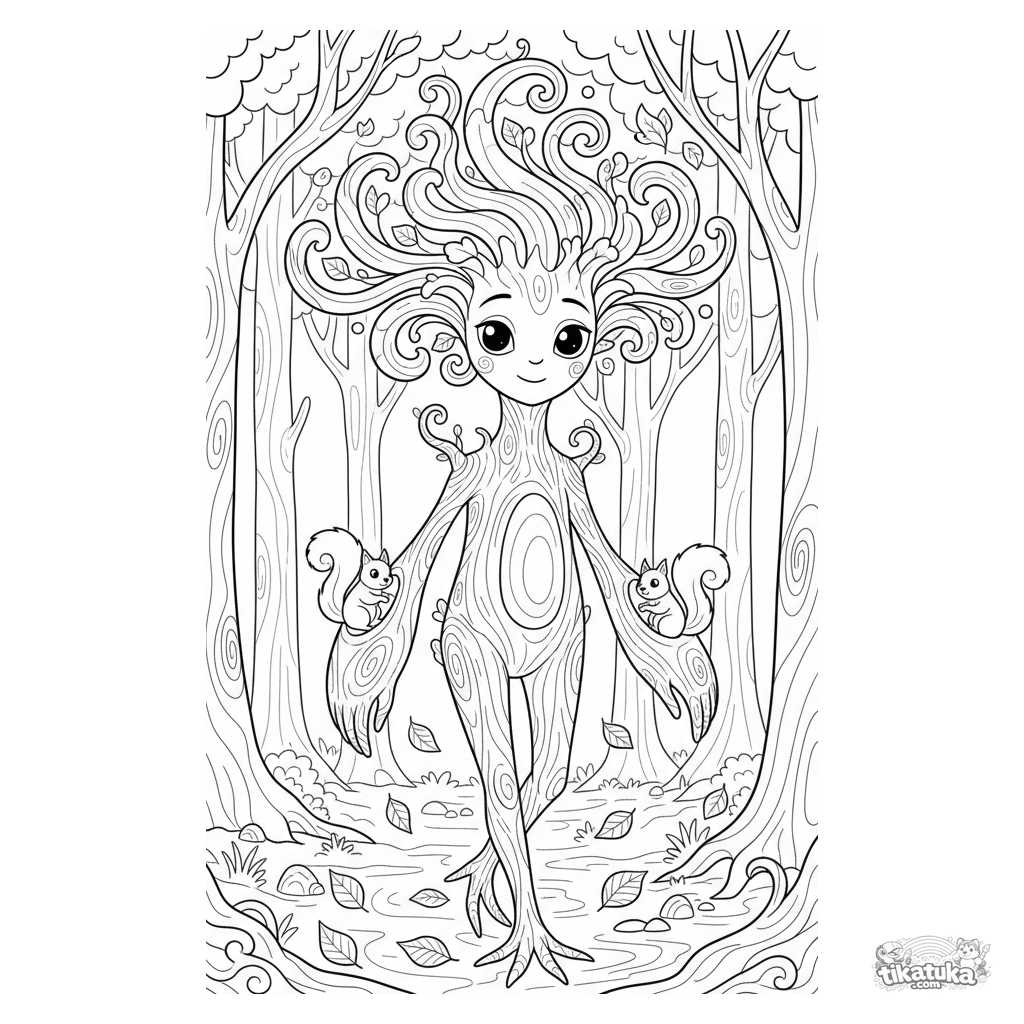 Página compleja para colorear para 10-12 años: un antiguo árbol ent camina lentamente por un bosque otoñal dorado. Escena detallada estilo art nouveau.