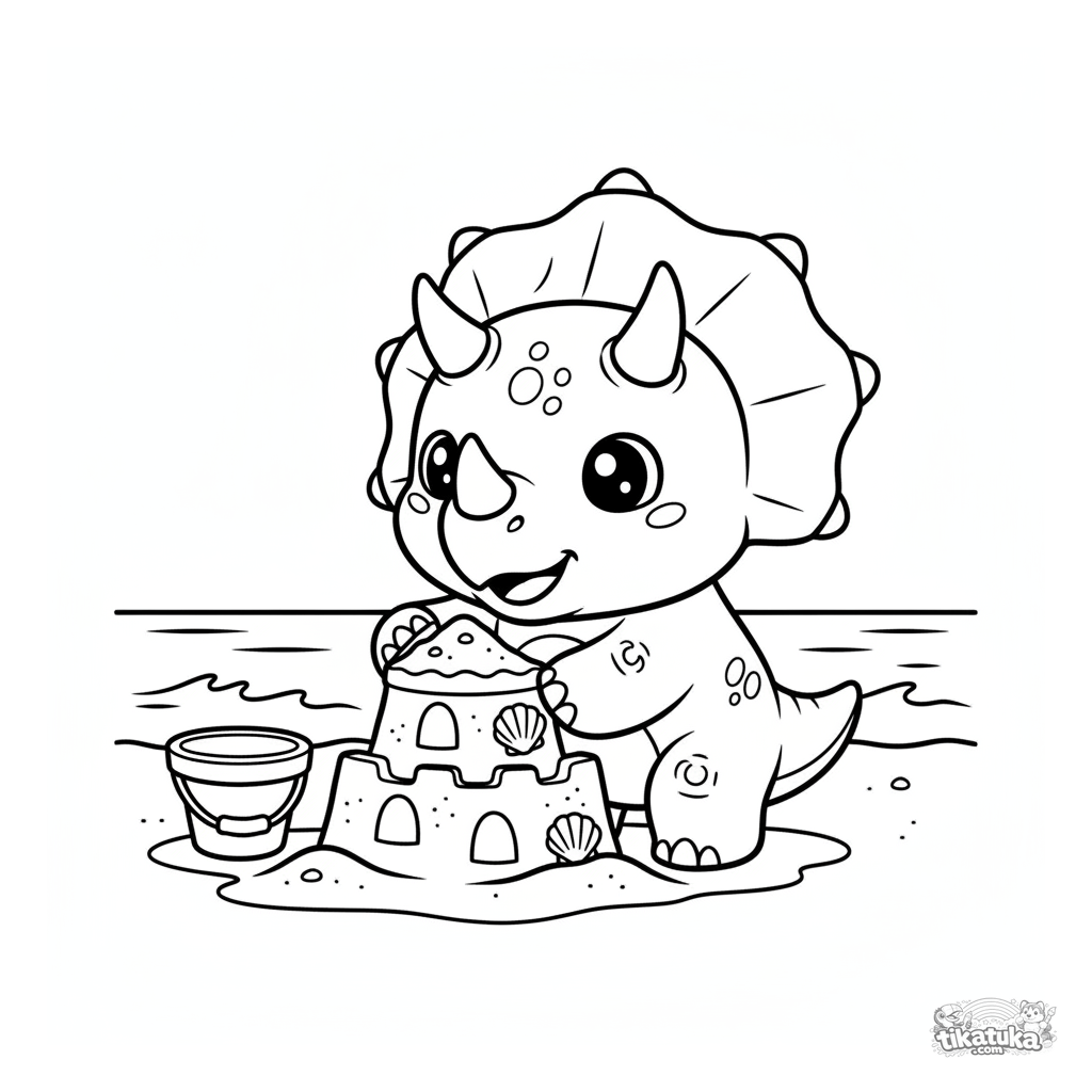 Página para colorear para niños de 4-6 años: un lindo triceratops estilo chibi construyendo un castillo de arena a la orilla de un océano antiguo.