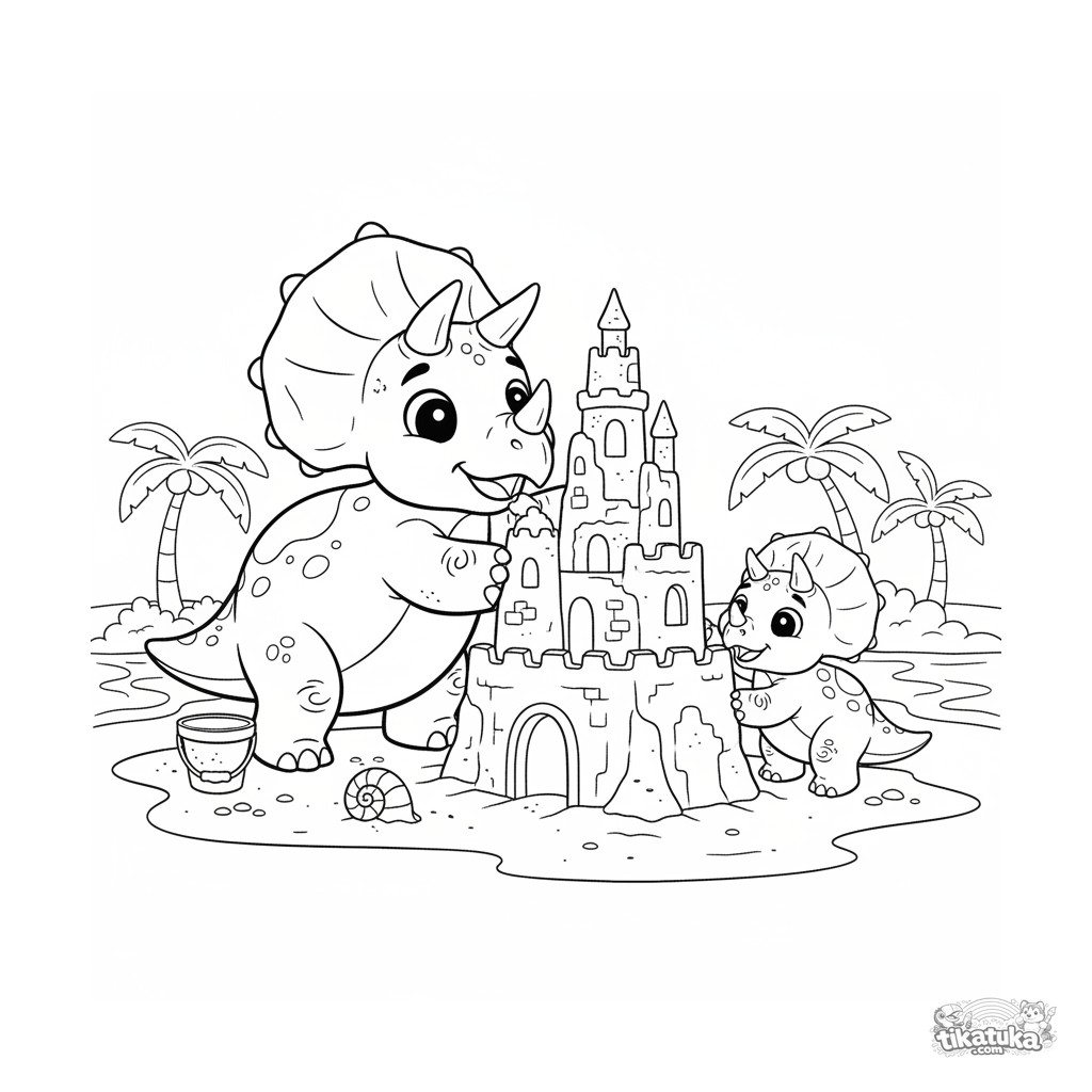 Página para colorear para niños 4-6 años: un alegre triceratops construyendo un castillo de arena con un juvenil en una playa antigua.