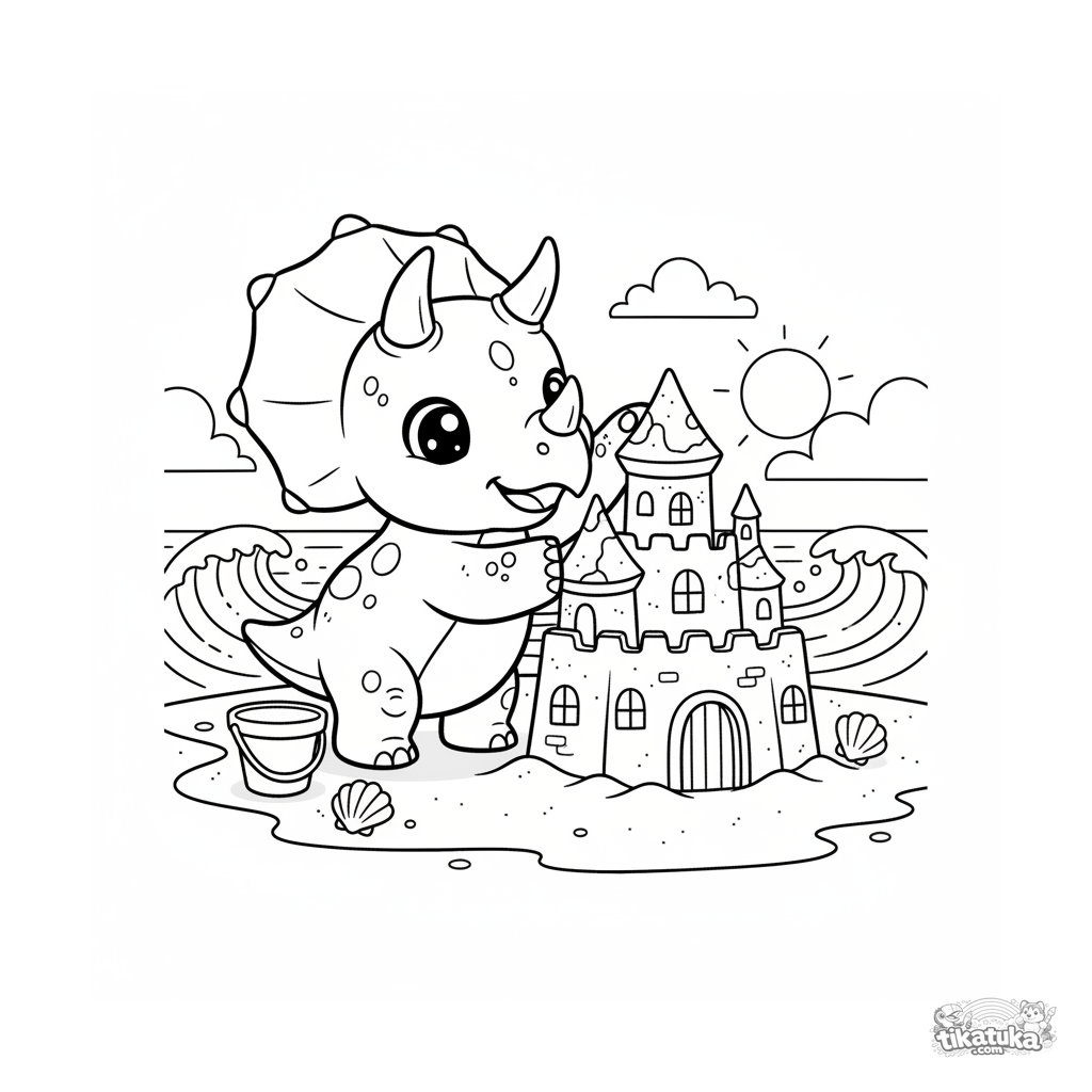 Página para colorear para niños de 4-6 años: un joven triceratops construye un castillo de arena en una playa oceánica antigua. Escena divertida, detalle moderado, expresión linda.