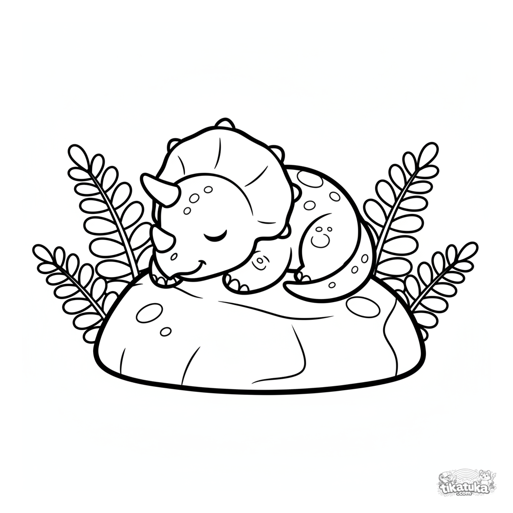 Página para colorear para niños pequeños: una linda cría de triceratops durmiendo plácidamente en una gran roca. Formas simples y grandes, perfecta para 2-3 años.