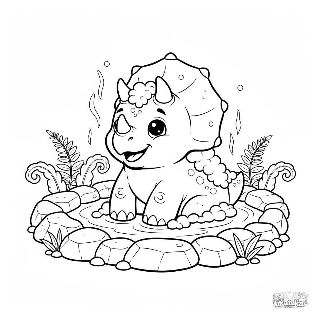 Página para colorear para niños de 4-6 años: un triceratops feliz toma un baño espumoso en una fuente termal volcánica rodeada de helechos.