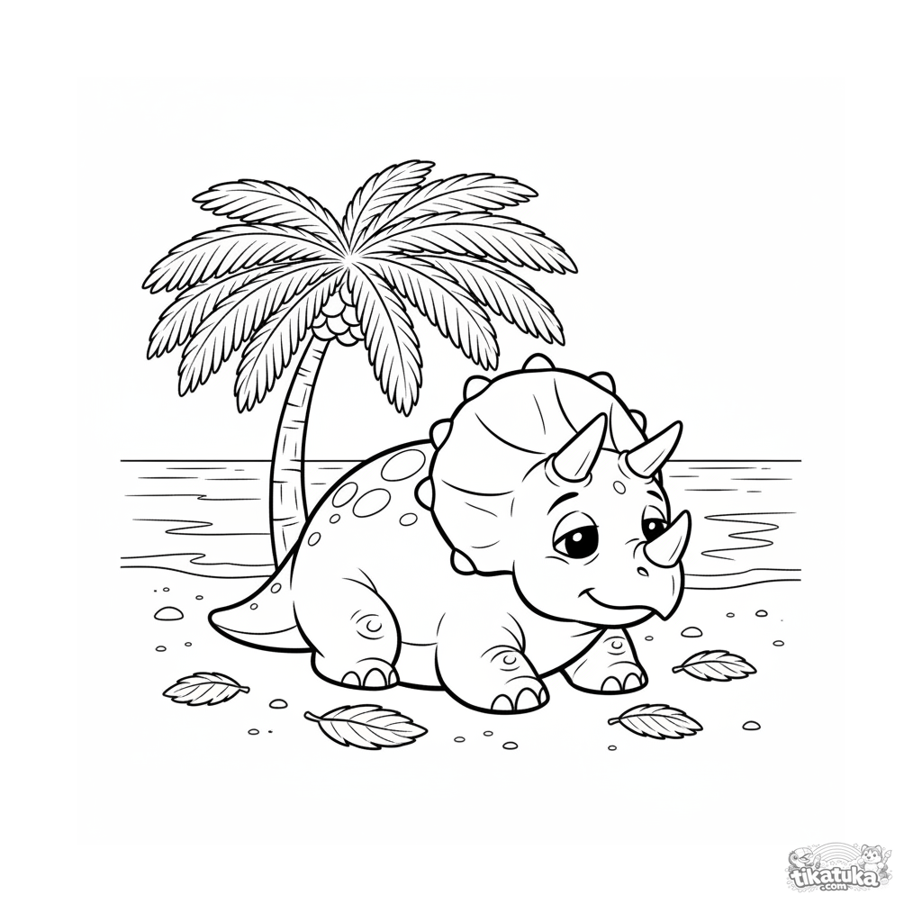 Página para colorear para niños de 4-6 años: un gran triceratops descansa a la sombra de una planta parecida a una palmera en la playa de arena de un océano antiguo. Escena tranquila y pacífica.