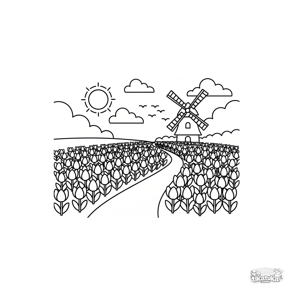 Página para colorear para niños de 7-9 años: un campo de tulipanes con un molino en el horizonte. Escena amplia en estilo de papel cortado.