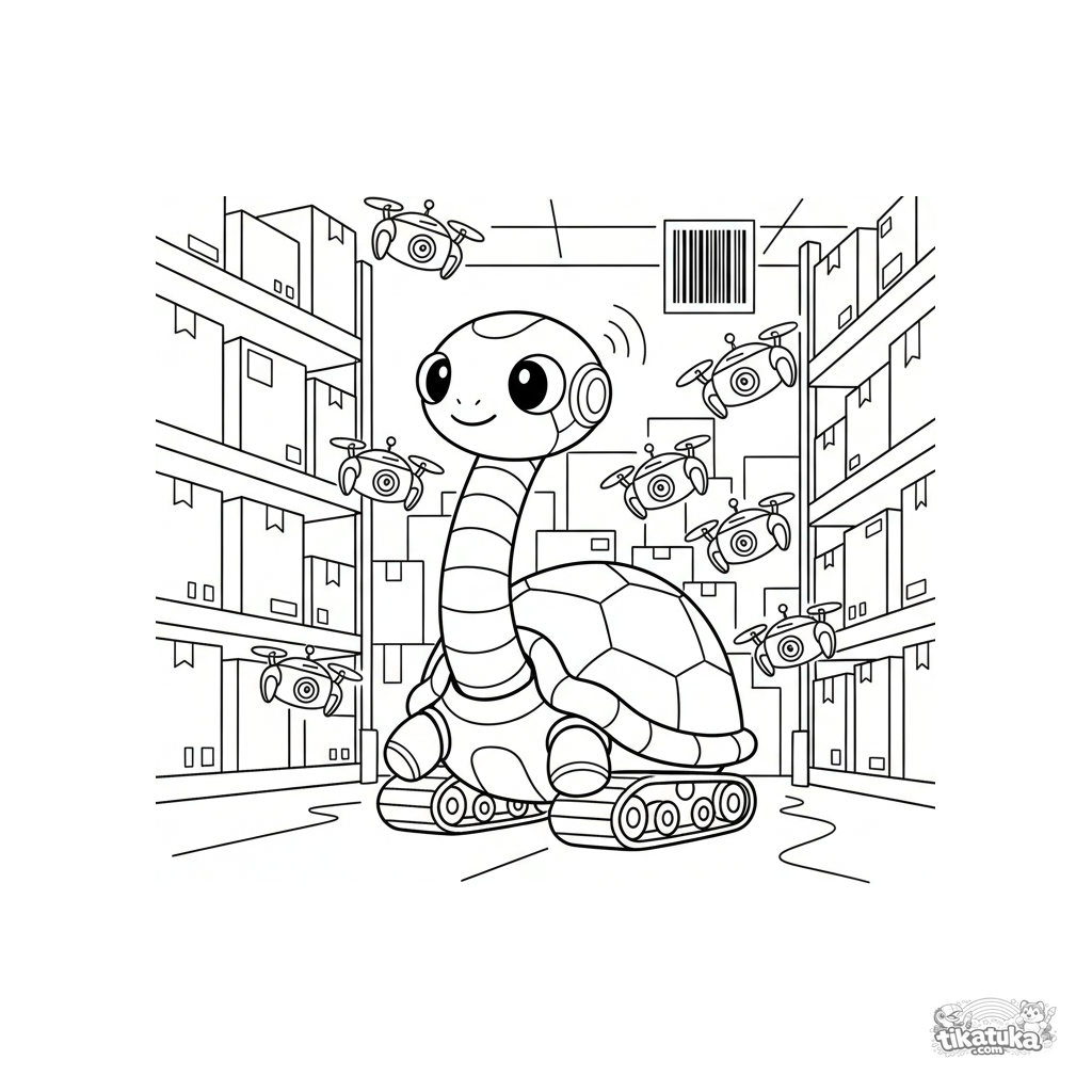Página para colorear para niños de 4-6 años: un lindo robot tortuga inspeccionando un almacén entre cajas y drones. ¡Imprime y colorea al inspector del futuro!