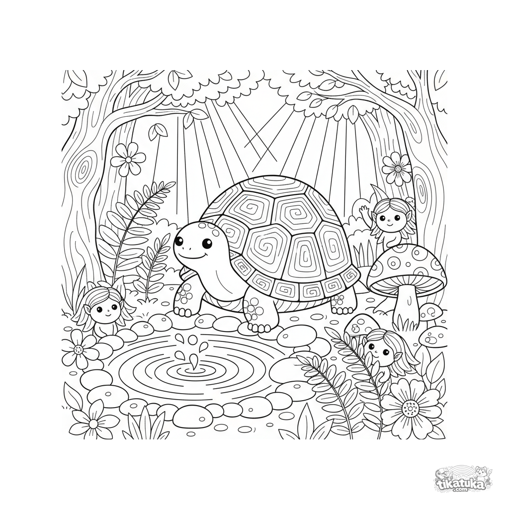 Página para colorear para niños de 3-6 años: una tortuga sabia guarda un manantial mágico en un bosque antiguo. Formas grandes y simples, personaje amigable.