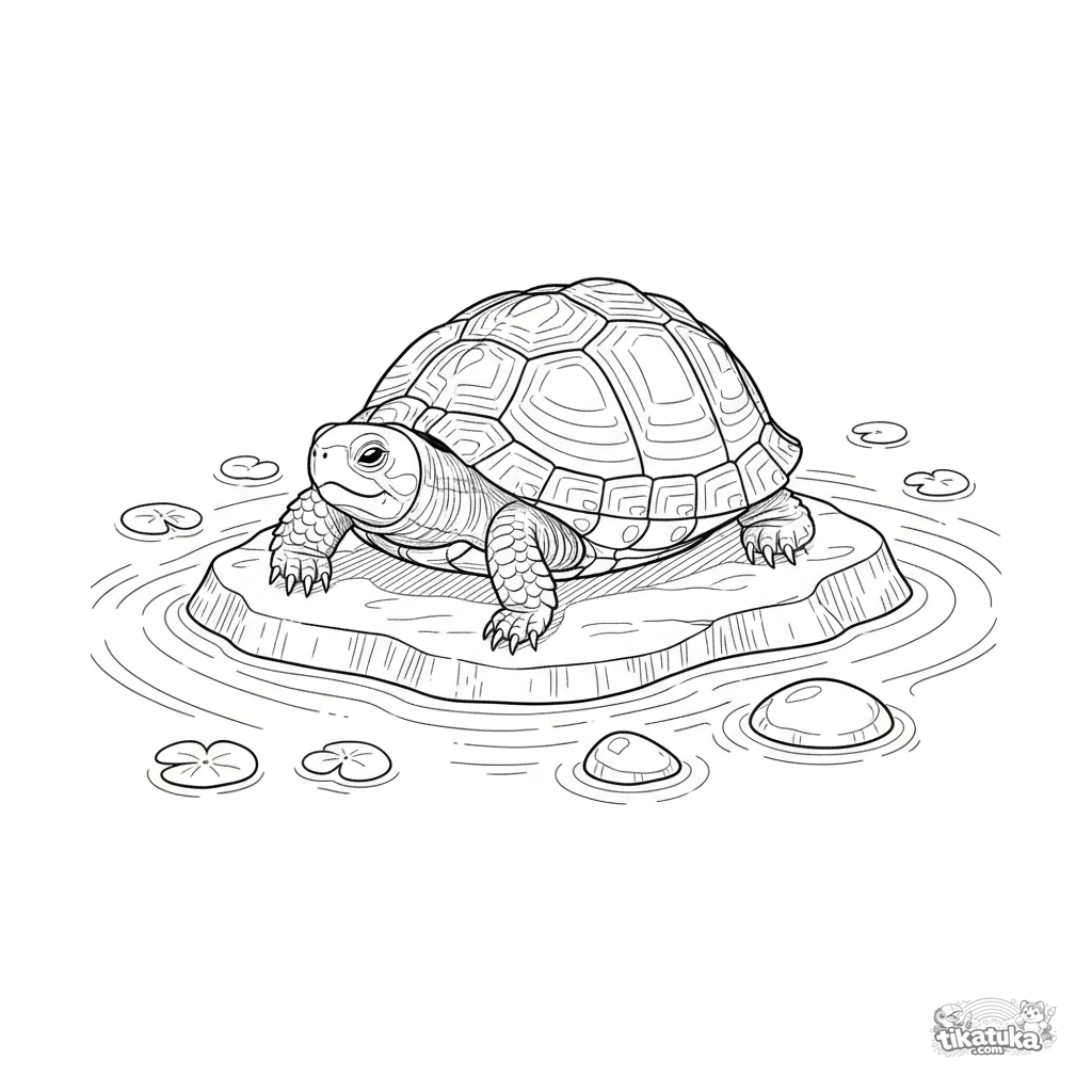 Página para colorear detallada para niños mayores de 10-12 años: una tortuga se asolea en una roca cálida en medio de un arroyo claro. Escena de paz en la naturaleza al estilo grabado.