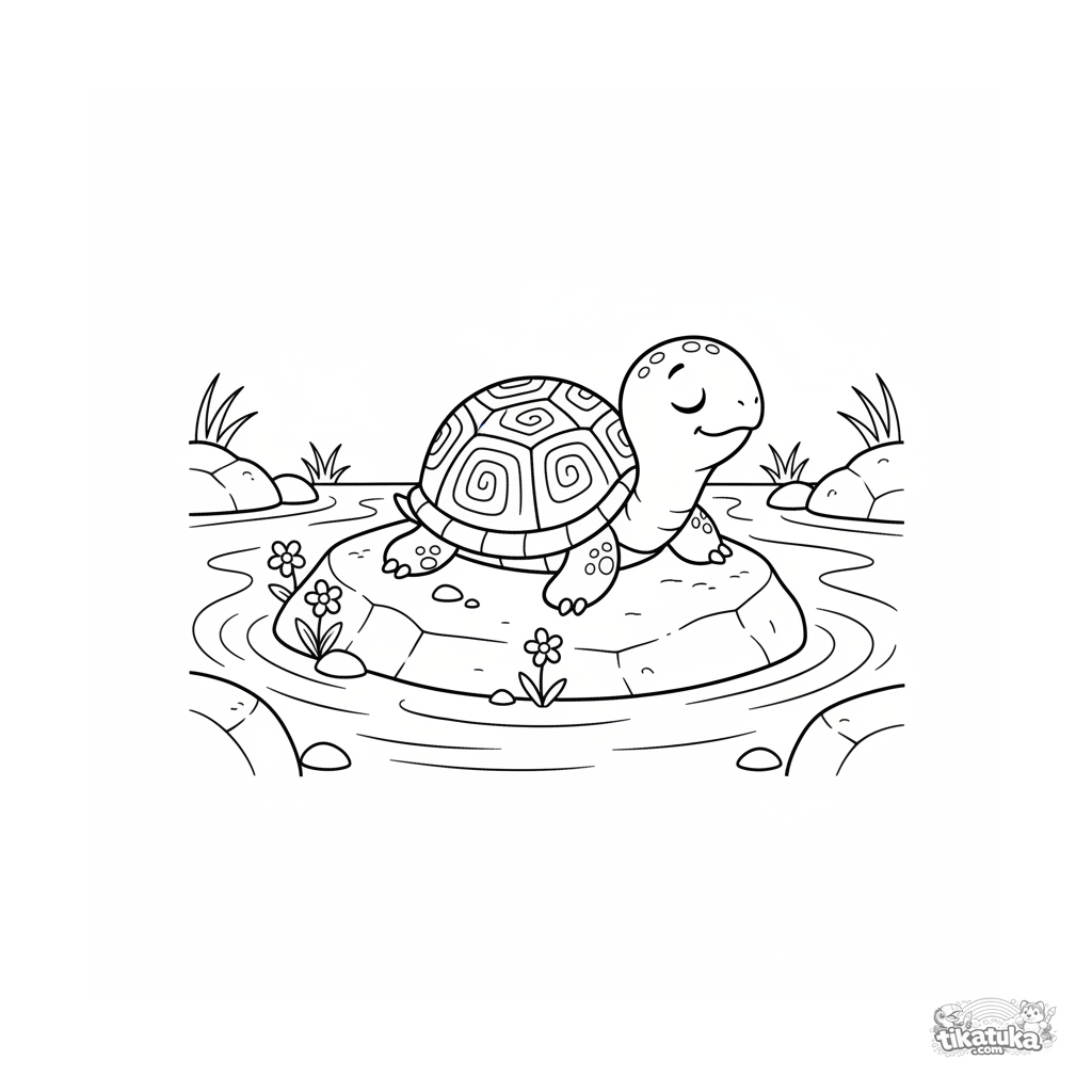 Página para colorear para niños 4-6: una pequeña tortuga se calienta al sol en una roca junto a un arroyo. Formas planas simples, patrón del caparazón, flores silvestres.