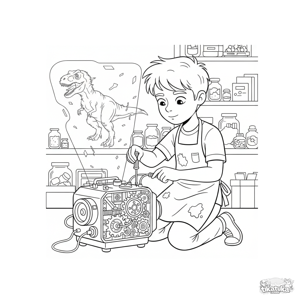 Página para colorear para preadolescentes 7-9: un niño inventor en un laboratorio secreto reparando un proyector de hologramas con imagen de dinosaurio. Herramientas y componentes detallados.