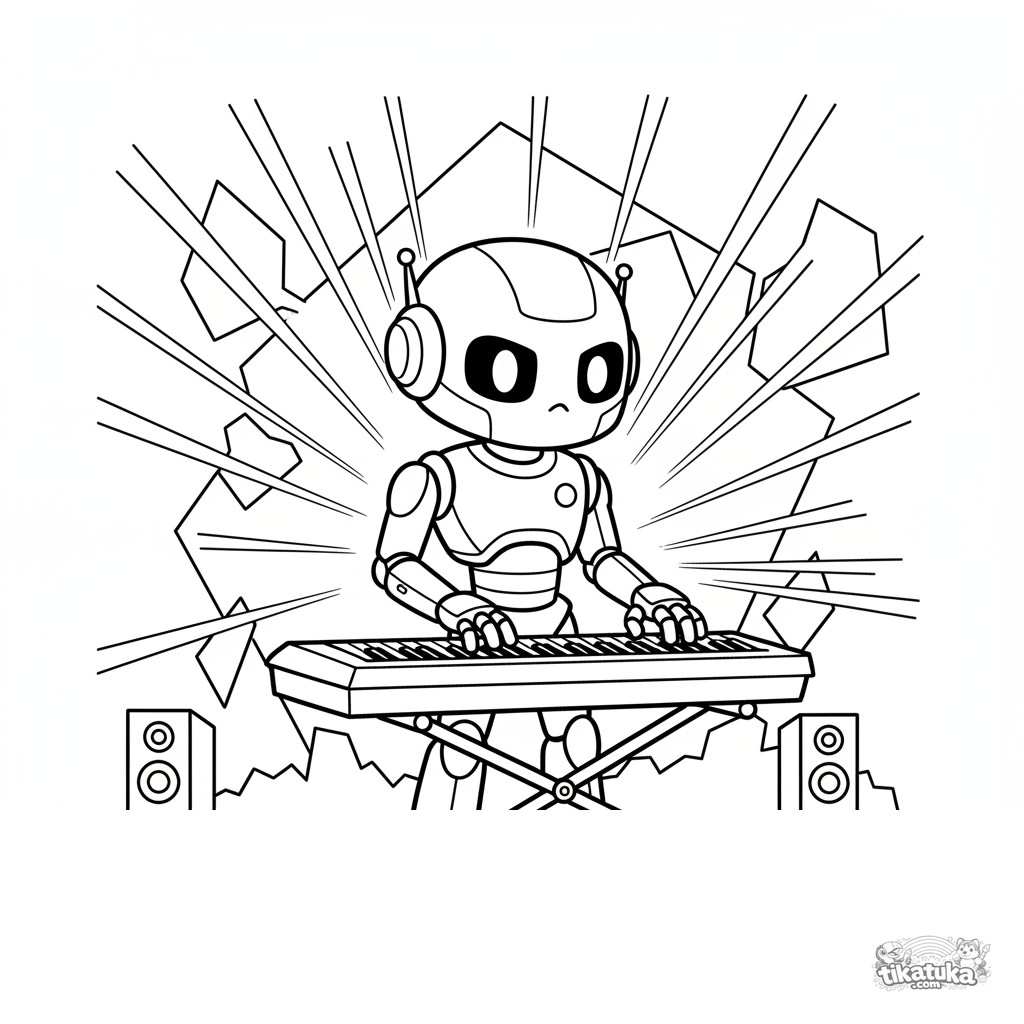 Página para colorear para preadolescentes de 7-9 años: un robot músico genial tocando un sintetizador en un escenario de concierto en medio de un espectáculo de luces láser. Líneas dinámicas, detalles interesantes del cuerpo del robot.