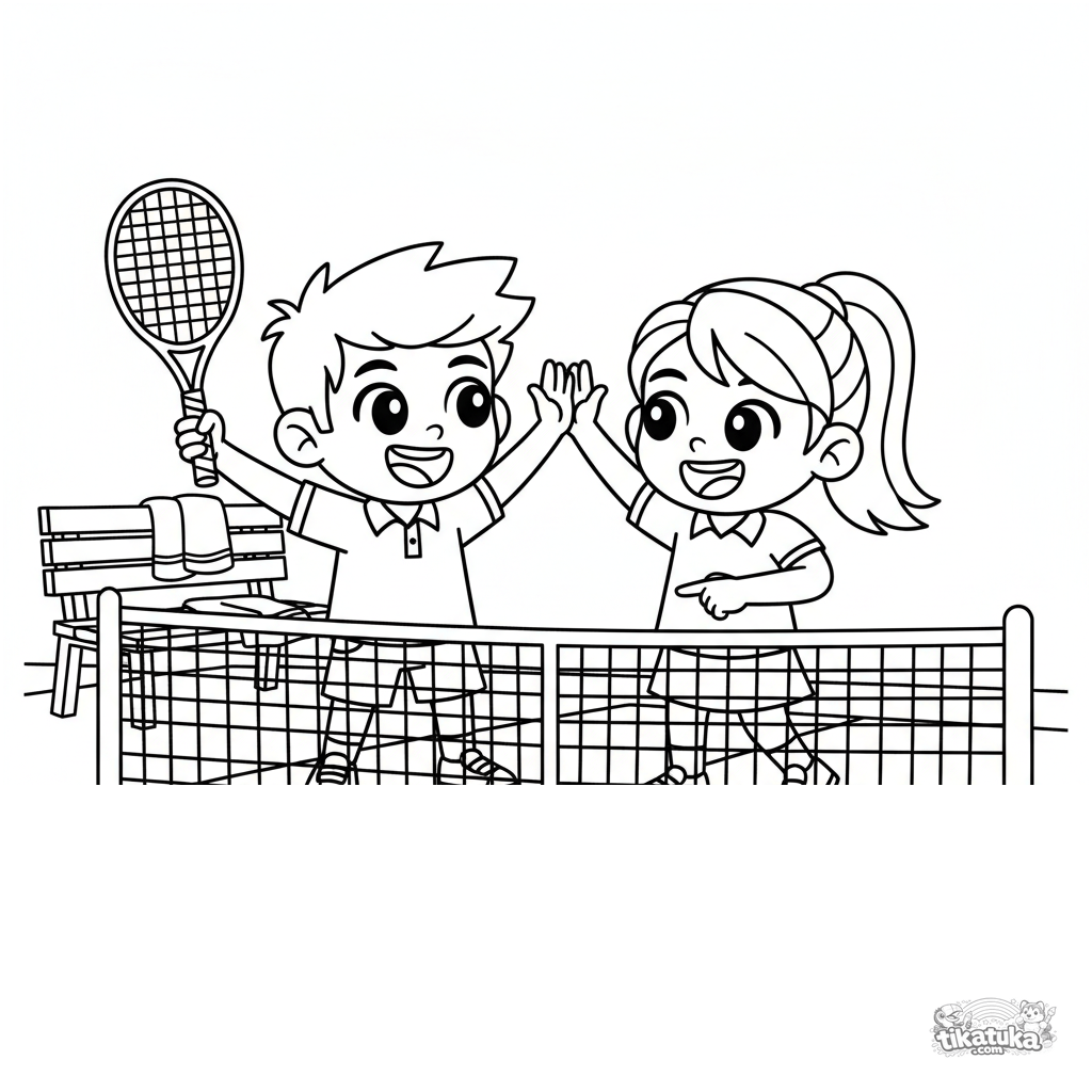 Página para colorear para niños de 7-9 años: partido de tenis dobles, momento alegre celebrando un punto ganado. Escena dinámica con dos personajes y detalles de la cancha.