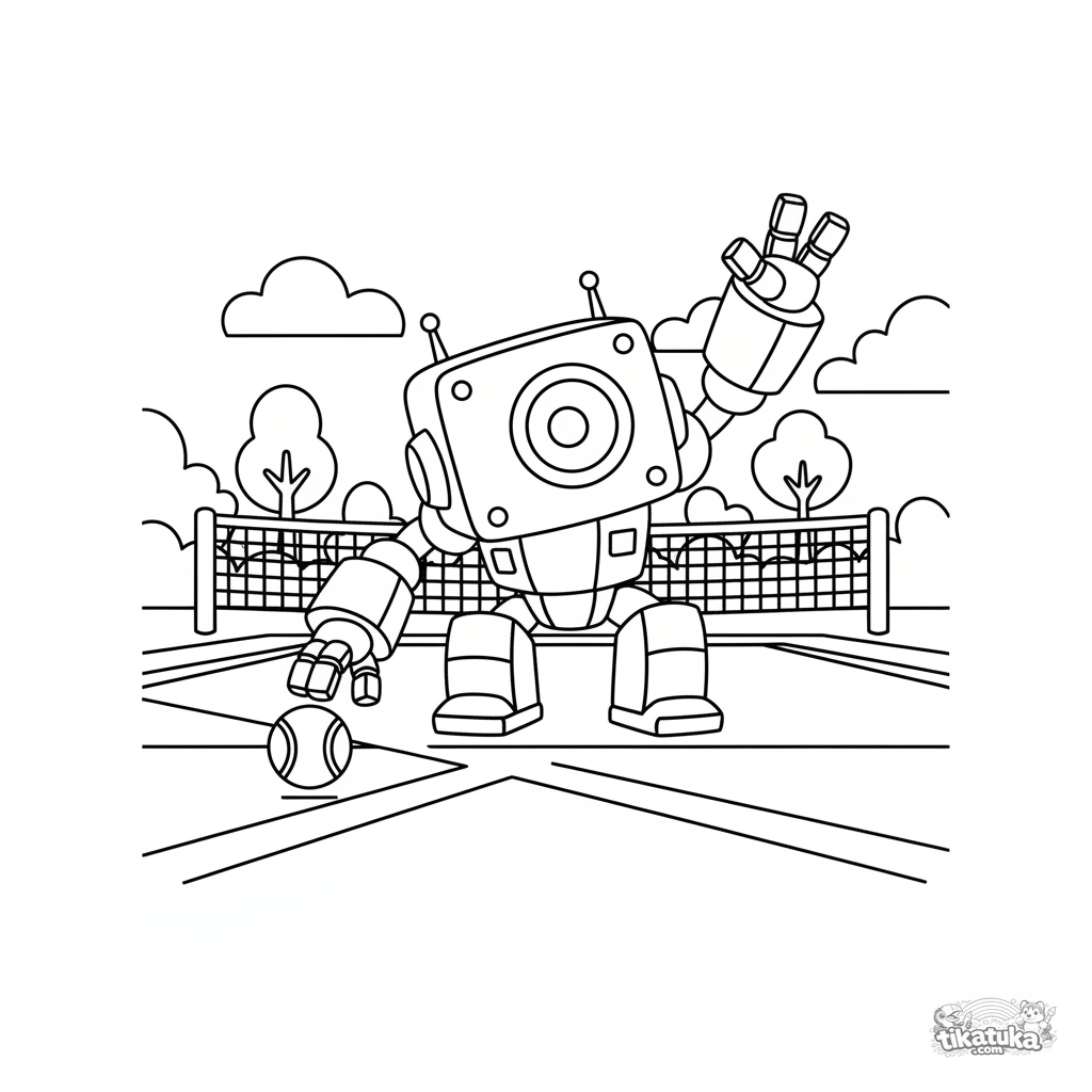Página para colorear para niños de 7-9 años: un robot juez en una pista de tenis señala que la pelota está dentro. Escena dinámica con detalles tecnológicos.