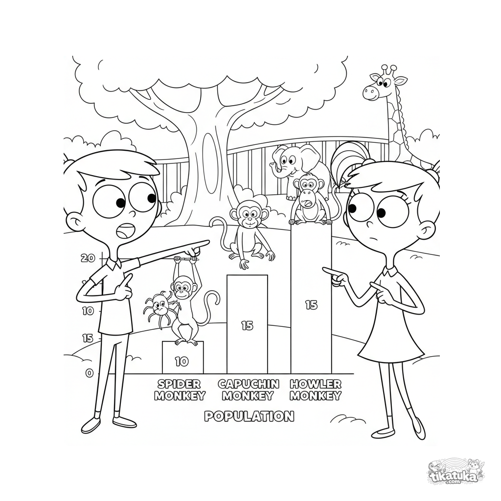 Página para colorear para 7-9 años: gemelos estudian un gráfico de barras colorido que muestra la población de diferentes especies de monos en el zoológico. Escena educativa que combina matemáticas y zoología.