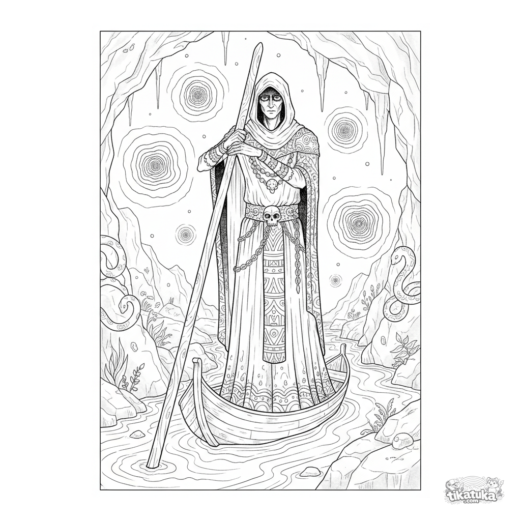 Página para colorear compleja para niños de 10-12 años: el misterioso barquero Caronte en un río subterráneo que fluye por la guarida de Medusa. Escena atmosférica en estilo acuarela boceto.