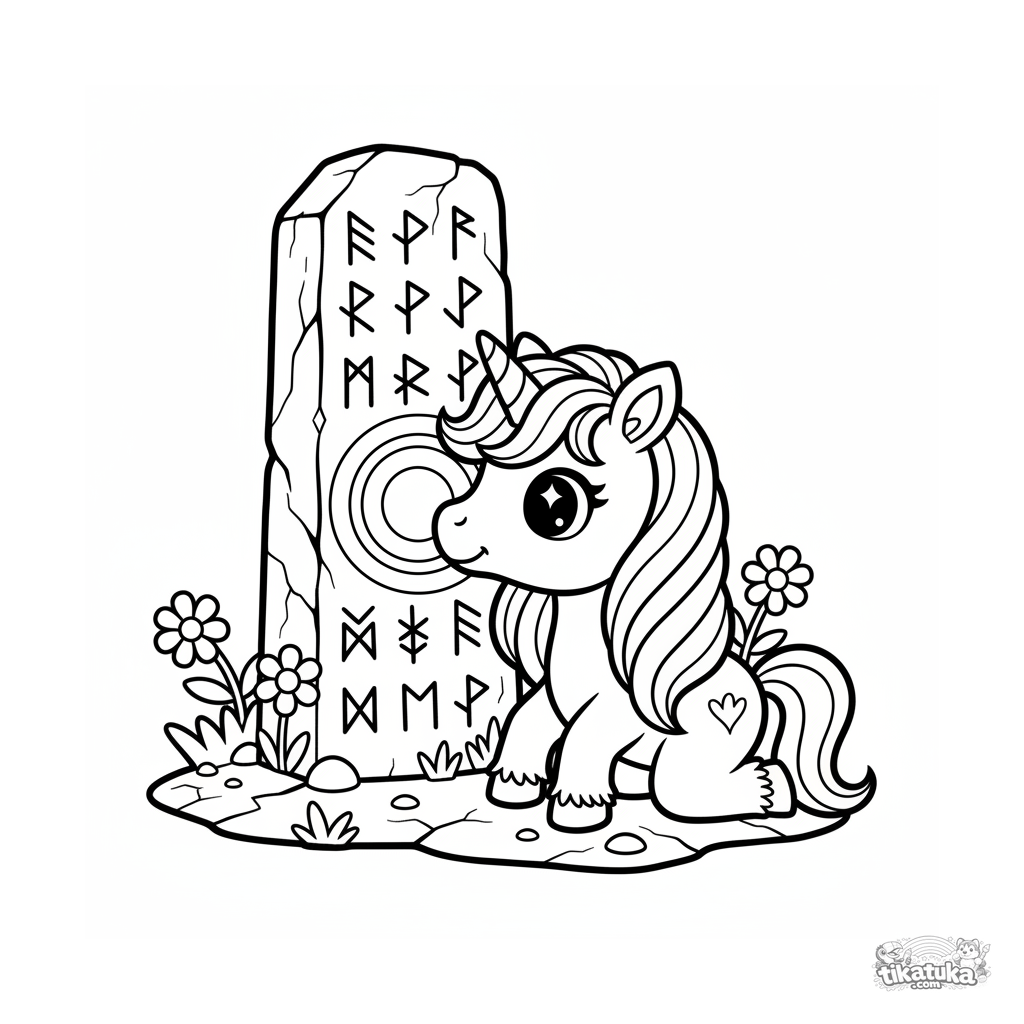 Página para colorear para niños pequeños: un potro de unicornio se maravilla con una runa brillante en la base de un monolito. Formas simples y grandes, márgenes amplios.