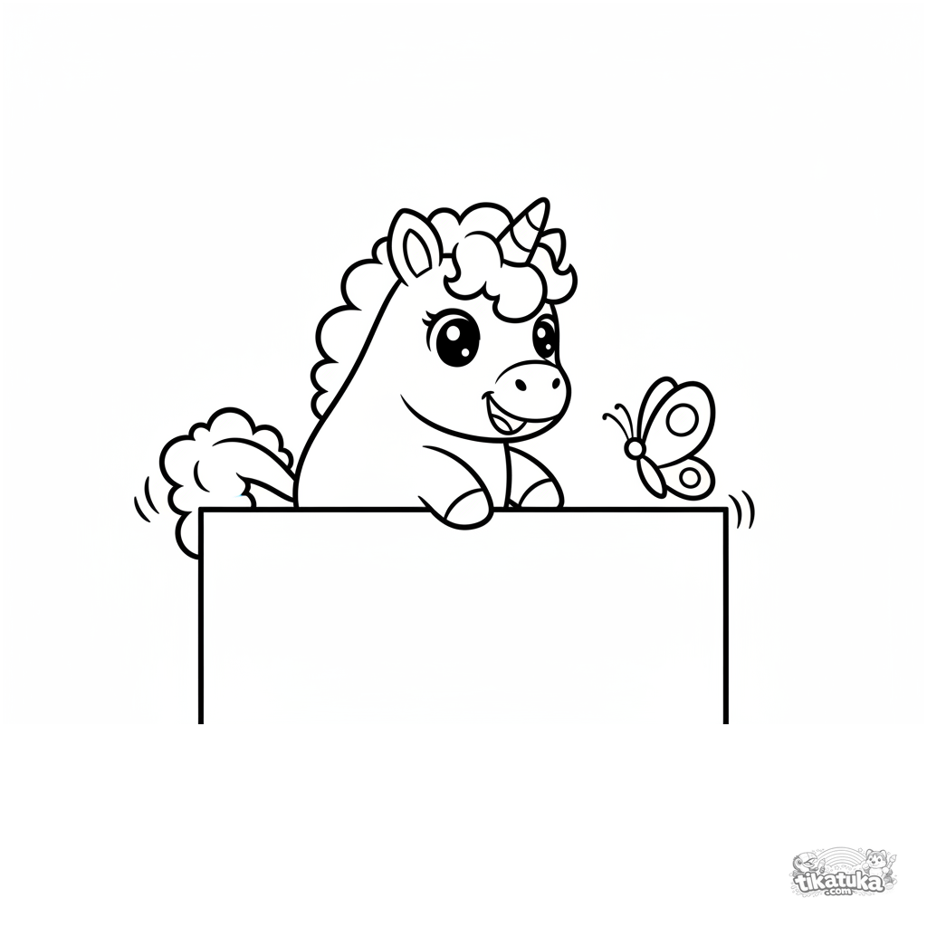 Página simple para colorear para niños de 2-3 años: un regordete potro de unicornio en estilo de peluche juega al escondite tras una piedra rúnica. Formas grandes y amigables.