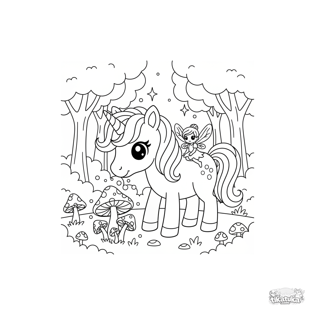 Página para colorear para niñas: un lindo unicornio pace setas brillantes en una arboleda encantada. Para niños de 4 a 6 años. Destellos en el aire, un hada en su lomo.
