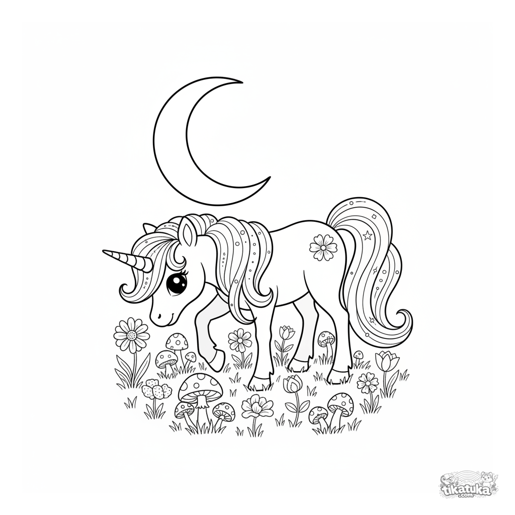 Página para colorear difícil de un poni unicornio mágico pastando en un prado a la luz de la luna. Para niños de 8 a 12 años. Escena detallada con flores nocturnas.