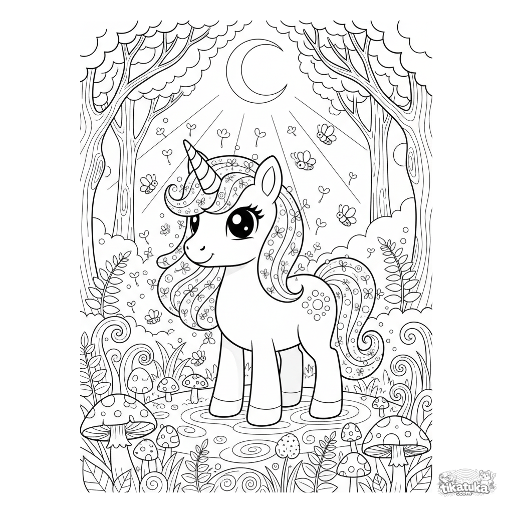 Página para colorear difícil para niñas de 7-12 años. Un poni unicornio mágico con crin brillante de semillas de diente de león en un claro del bosque.