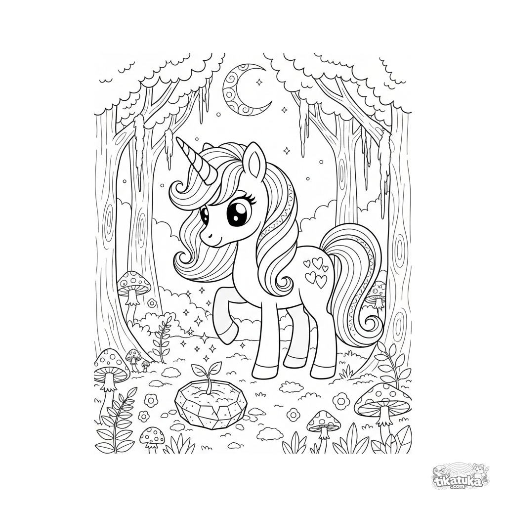 Página para colorear mágica y difícil para niñas de 8-12 años. Un poni unicornio con cuerno de cristal custodia un brote mágico en una arboleda a la luz de la luna.