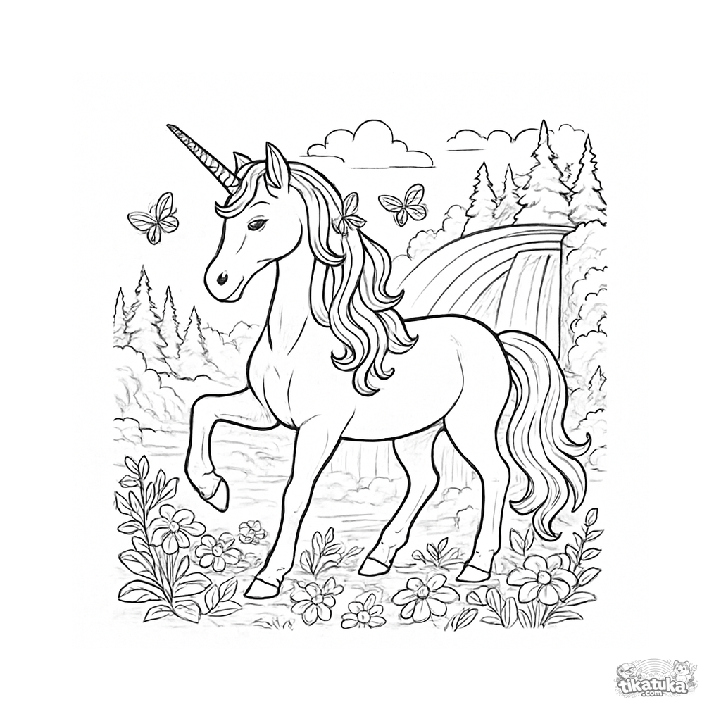 Página para colorear para niños. Unicornio blanco con cuerno brillante junto a cascada arcoíris, mariposas en crines, flores silvestres. Descarga gratis.